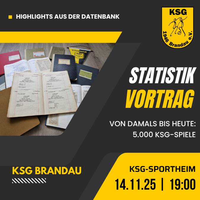 Am Freitag, den 14. November 2025 findet ab 19:00 Uhr im Sportheim der KSG Brandau ein Statistik-Vortrag zu diesem Thema statt. Eingeladen sind alle Interessierten, natürlich sind auch Nicht-Mitglieder sehr herzlich willkommen. Unser 1. Vorsitzender Stefan Roth wird Euch an diesem Abend die Highlights der KSG-Datenbank präsentieren und auch einen Blick hinter die Kulissen geben. Wir freuen uns auf Euer Kommen! Weiterlesen … Statistik-Vortrag: Von damals bis heute – 5.000 KSG-Spiele